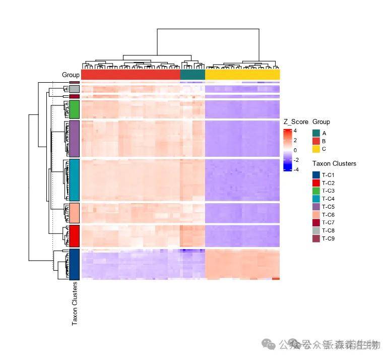 通过聚类热图展示不同样本中物种 / 功能丰度变化,颜色深浅反映了物种/功能丰度高低。此外进行层次聚类,将更相似的微生物 / 功能或分组聚到一起。能够直观地展示微生物 / 功能在不同样本中的趋势变化以及它们之间的聚类关系。