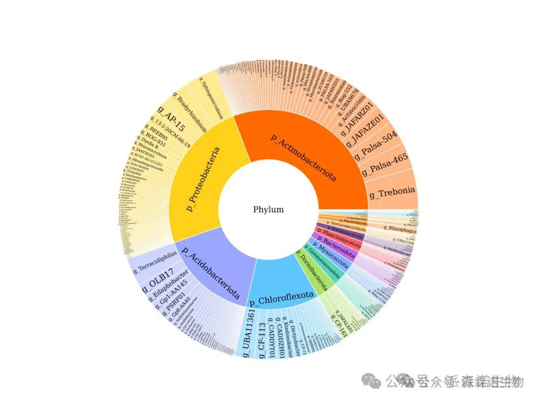 圈图从内到外依次代表域、门、纲、目、科、属,种七个分类水平(或其他指定分类水平),扇形的大小反映了不同分类单元的相对丰度高低,并给出具体数值。在每个分类水平,各分类单元以不同的颜色加以区分。