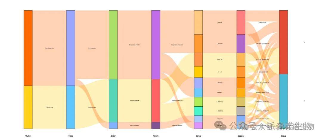 桑基图展示数据的“流动”变化,分支的宽度表示流量的大小,应用于不同层级物种丰度数据的可视化。桑基图由于每个流向的数据不一样,桑基图中的流线也宽窄不一,边的宽度与丰度成比例的显示,边越宽,丰度数值越大。