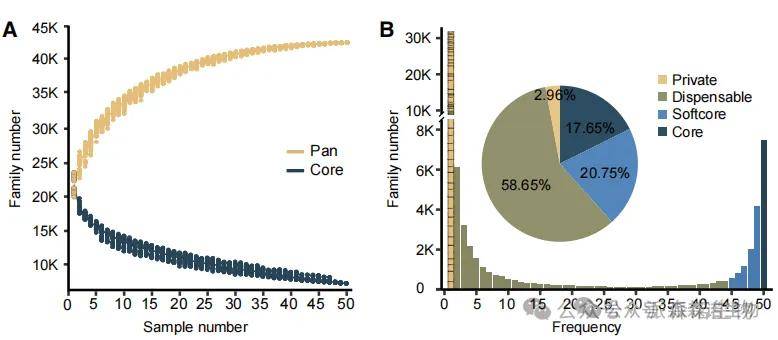 图1.50个马铃薯样本的泛基因组和核心基因组分析。