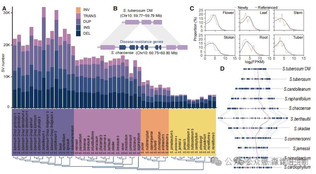 本研究从头组装28个基因组和22个已发表的基因组,被用于泛基因组构建。随着基因组数目的增加,pangenes的数量增加,而核心基因的数量减少,并在50个基因组时达到最大值。这表明这50个基因组是多样化的,单一参考基因组无法捕捉到马铃薯的全部遗传多样性 (图1A)。核心组由7485个基因家族 (536,166个基因) 组成,存在于所有50个资源中,软核心组由8798个基因家族 (585,598个基因) 组成,存在于45-49个资源中。可有可无的一组由24,869个基因家族 (488,514个基因) 组成,存在于2-44个品种中,而私有的一组则由1,254个基因家族组成 (图1B)。
