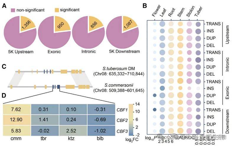 研究SVs对基因表达的影响,使用至少在五个访问中存在SV而在至少五个其他资源中不存在的SVs基因对来分析SV相关基因的表达影响。总共评估了20,945个SV,发现4,249个SVs在28个种质的6个组织中显著影响基因表达 (p< 0.05,曼-惠特尼检验)。有更大比例的SVs(23%,4103个SV基因对中的950个) 影响编码序列 (外显子、trans和DUPs的indels) 与影响调控区的SVs相比 (19.6%,16,842sv基因对中的3299对),与表达差异显著相关 (图3)。