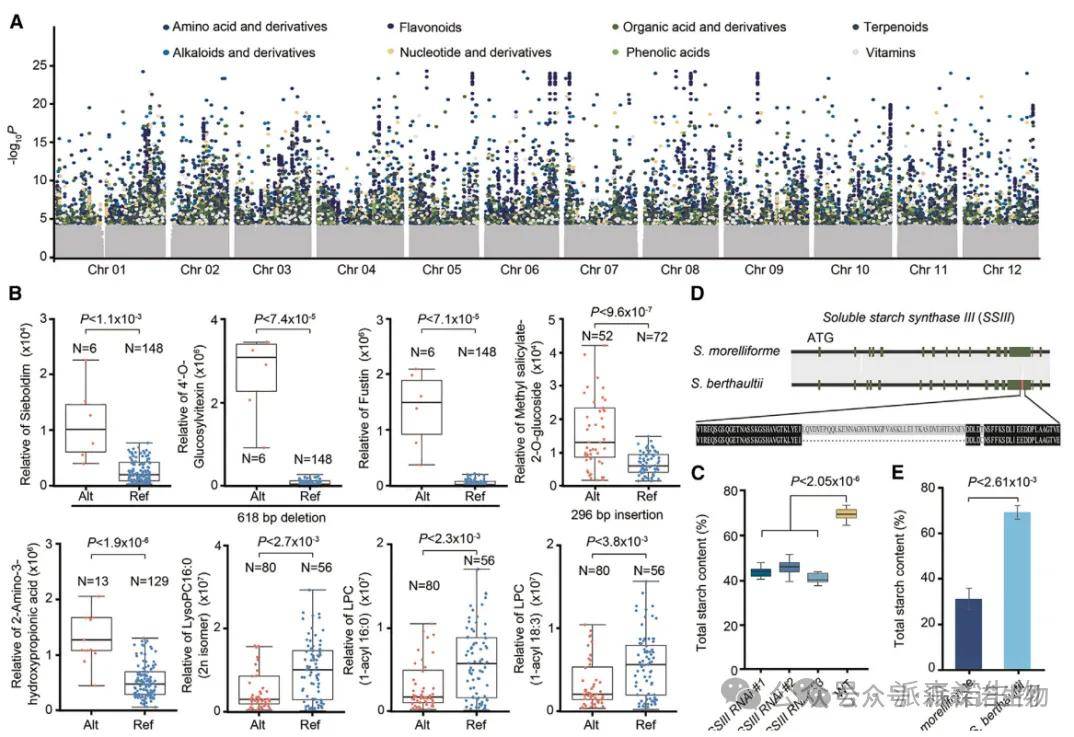 马铃薯是世界上最重要的非谷物作物。在这项研究中,为了评估马铃薯部分内的遗传多样性,对29个野生种及地方品种的基因组进行了高质量的组装工作,并且有248个(野生马铃薯,地方品种,现代栽培品种)进行了>253X重测序。以DM8.1为骨架构建了一个基于图的泛基因组,整合了194,330个非冗余结构变体。为了描述块茎的代谢组和阐明代谢性状的基因组基础,采用lc-ms/MS技术获得了157个种质的代谢组和9,321个结构变异 (SVs)。通过基于存在和缺失变化的代谢组学-GWAS分析,检测到与1,258种不同的代谢物显着相关,包括黄酮类代谢物,酚酸和磷脂。为了促进泛组资源的利用,开发了一个综合平台 -- 马铃薯泛组数据库 (PPDB)。本研究为解剖马铃薯农学和代谢性状的基因组基础提供了全面的基因组资源,这将加速马铃薯功能基因组学研究和遗传改良。