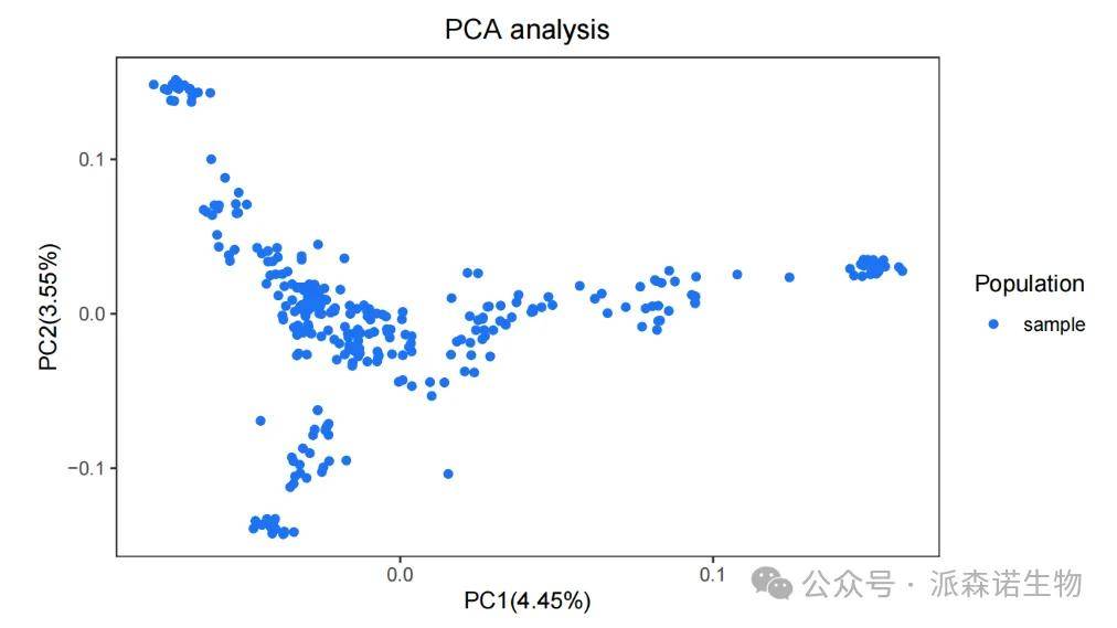 主成分分析(Principal Component Analysis,PCA):一种分析、简化数据集的统计方法。PCA 分析经常用于减少数据集的维数,同时保持数据集中的对方差贡献最大的特征。在群体研究中,通常利用个体基因组 SNP 的差异,将不同个体按照主成分聚类成不同的亚群。