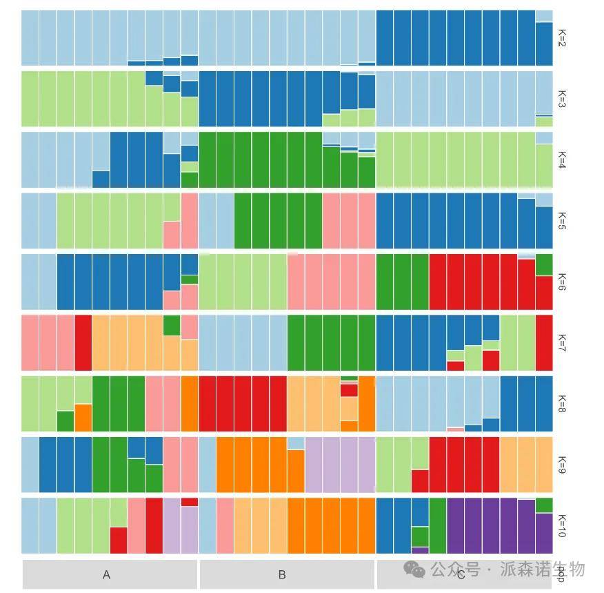 利用 SNP 信息分析群体的遗传结构,设置不同K值(即假设存在多个祖先群体)模型选择为混合模型,图片中每一列代表一个个体,不同颜色片段的长度表示该个体基因组中某个祖先群体片段所占的比例。