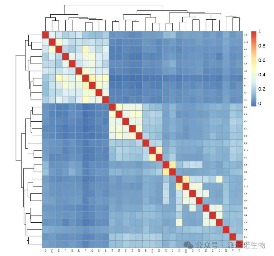 G值是GRM中的元素,表示两个个体间标准化的基因组相似性。横纵坐标为样本ID,即每一个方块表示对应横纵坐标的两个样本间的G值大小。方块的颜色越接近红色,表示G值越大,关系越近;颜色越蓝,表示G值越小,关系越远。其中,对角线元素表示个体自身的基因组相似性;非对角线元素表示个体间的亲缘关系相似性。