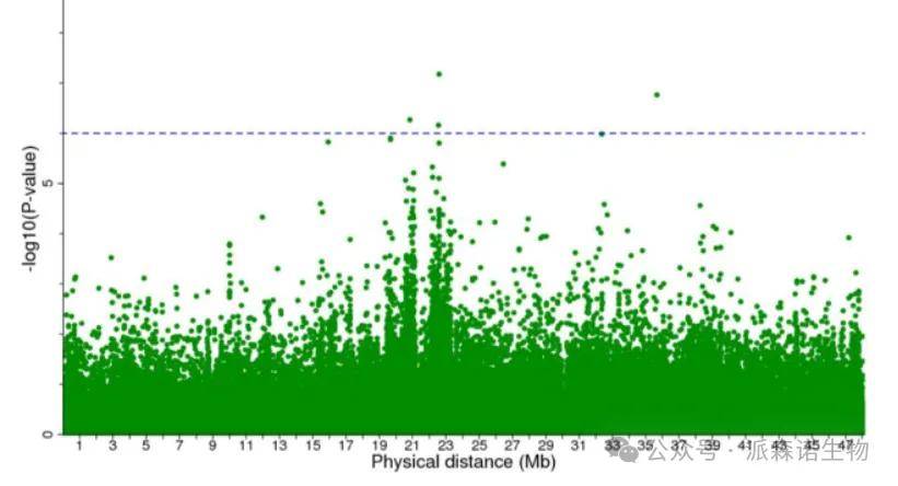 曼哈顿图,横坐标为染色体物理位置,纵坐标为P值取-log10。一个点代表一个SNP。P值越小,即-log10(P value)越大,该位点与性状的相关性越强。虚线表示-log10(P)的阈值,超过阈值的是和性状关联的候选位点。