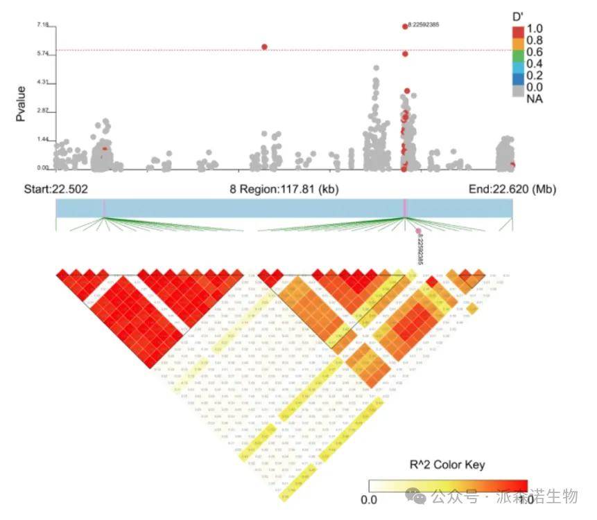 一般情况下,全基因组关联分析的曼哈顿图常常与染色体位置、LD-Block图进行联合分析,根据显著关联的SNP位点确定注释的染色体区域,同时在该区域进行LD-Block分析,找到与该位点连锁较强的其他SNP位点,并对其所在的基因进行功能注释。