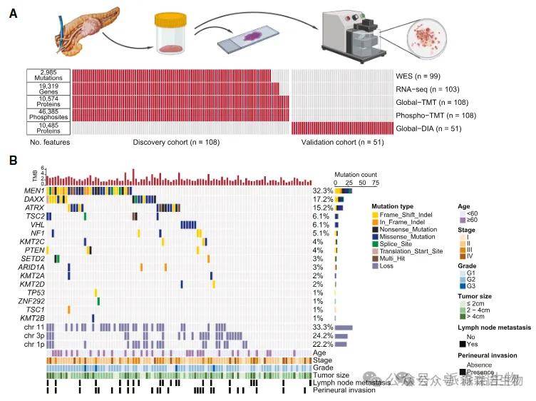步骤一:研究收集108例中国的NF-PanNET病例作为发现队列,对肿瘤组织及配对癌旁组织进行了全面的多组学分析。一组独立的51例NF-PanNET病例被用作验证队列。