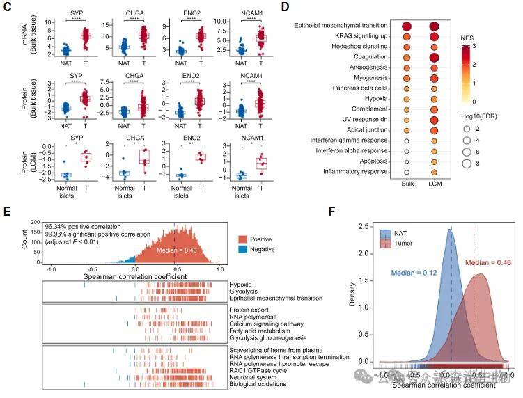 GSEA分析也分别强调了肿瘤中上调途径活性的一致性,包括癌症相关途径和与内分泌功能相关的途径。其中参与缺氧、糖酵解和上皮-间质转化(EMT)的分组显示出最高的mRNA-蛋白质相关性(图E)。