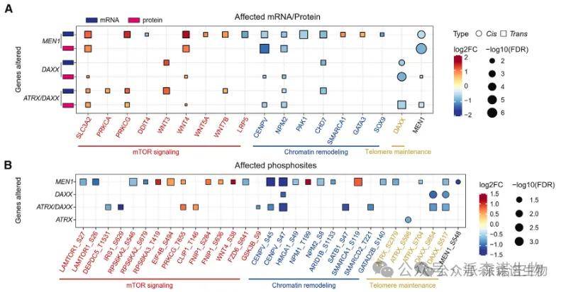 分析NF-PanNET中三种最常见的突变基因(MEN1、DAXX和ATRX,占总患者的51%)的体细胞简单突变对其对应mRNA、蛋白表达和磷酸化水平的影响(顺式效应),以及对与PanNET相关通路中其他基因的影响(反式效应)。