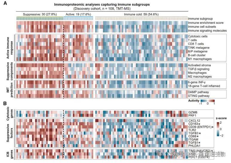 免疫亚型与四种蛋白质组学亚型和三种蛋白质特征定义的风险组显示出显著关联,如免疫抑制亚组富含高危患者和C1亚型。
