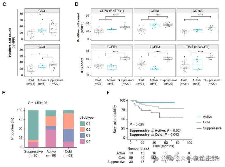 不同免疫亚型之间存在显著的生存差异,其中免疫抑制亚组表现出更差的预后。