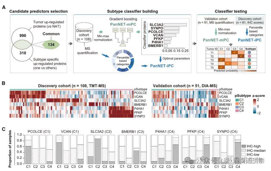 通过无监督聚类应用于蛋白质组图谱的发现队列,在108例NF-PanNETs患者中确定了四种蛋白质组学亚型。这些亚型与患者预后和免疫特征相关,