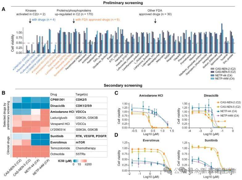 步骤五:通过患者来源肿瘤类器官药物筛选,发现细胞周期依赖性激酶(CDK)5和钙电压门控通道亚基α1D(CACNA1D)分别为广谱性和亚型特异性治疗靶点,且在小鼠异种移植模型中完成体内验证。