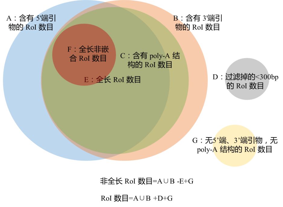 数据过滤后得到高质量的Reads of Insert(RoI),接着对其进行转录本分类。理论上完整的RoI应该有5’primer、3’primer和polyA部分。但在实际测序中,由于5’端降解等因素,并不是所有的RoI都是完整的,即不是全长转录本序列,而且有少部分RoI序列为嵌合体。因此通过检测RoI序列是否含有 5’primer, 3’primer和polyA以及其位置的关系, 将RoI序列分为全长非嵌合(Full-Length-Non-Chimeric)序列、全长嵌合(Full-Length-Chimeric)序列、非全长(Non-Full-Length)序列等。其中全长非嵌合序列即是物种原始的全长mRNA序列,各分类之间的相互关系见下图: