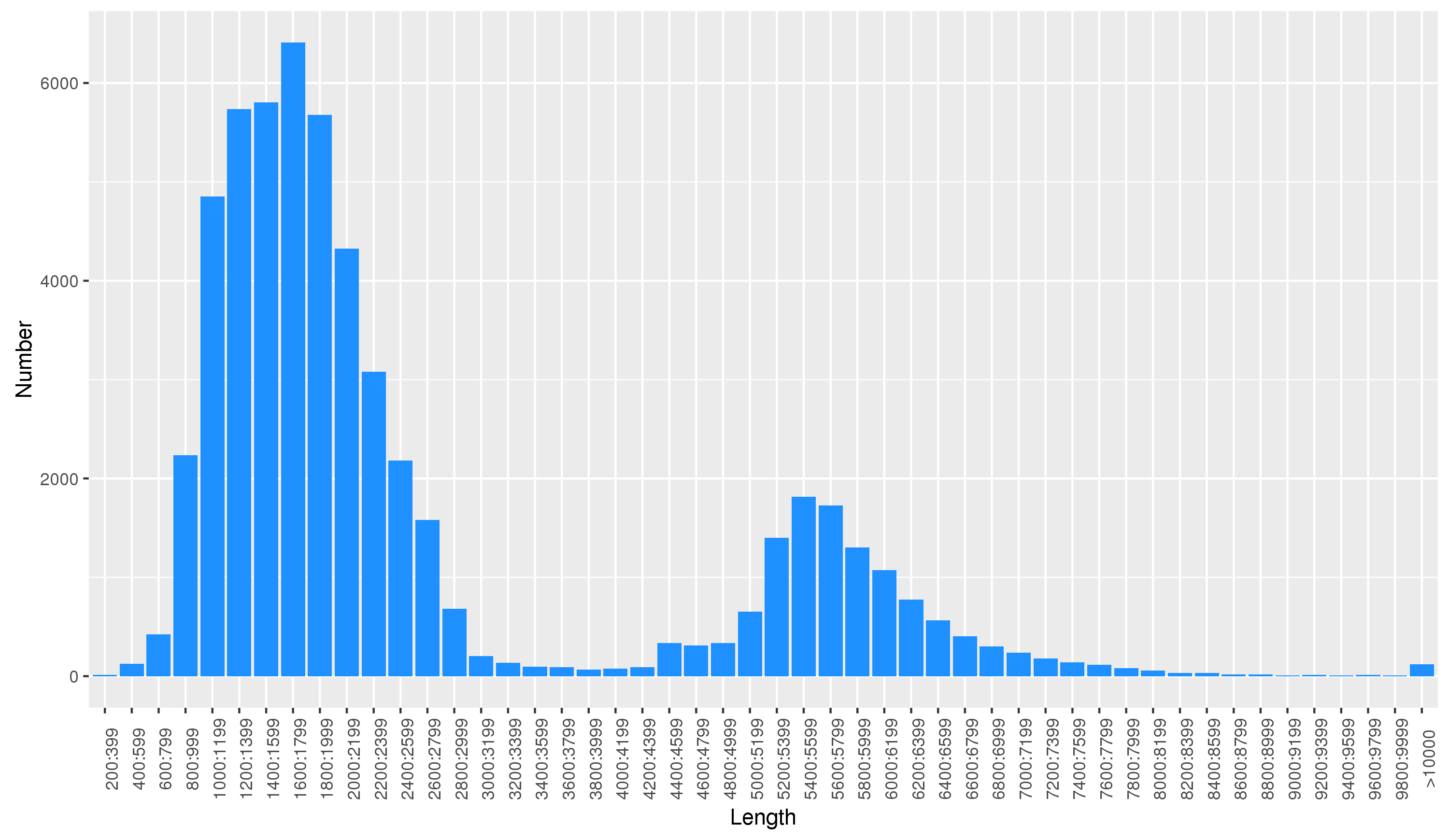 全长非嵌合序列中存在大量的冗余序列,我们将冗余序列聚类到一起,得到新的一致性序列(Consensus Isoforms),然后将非全长序列比对到一致性序列上进行校正,最终得到准确度大于99% 的高质量Isoform(即转录本)。下图是Isoform长度分布图,长度分布的区间与文库片段的选择有关。