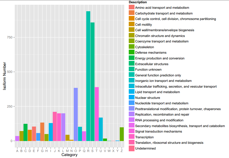 对于比对到基因组上的score为0-5的known Isoform采用有参考基因组注释方法,对于Novel Isoform采用无参考基因组注释方法。基因功能注释所用到的数据库包括 GO、KEGG、eggNOG、NR、Swiss-Prot等。下图是其中的eggNOG注释结果: