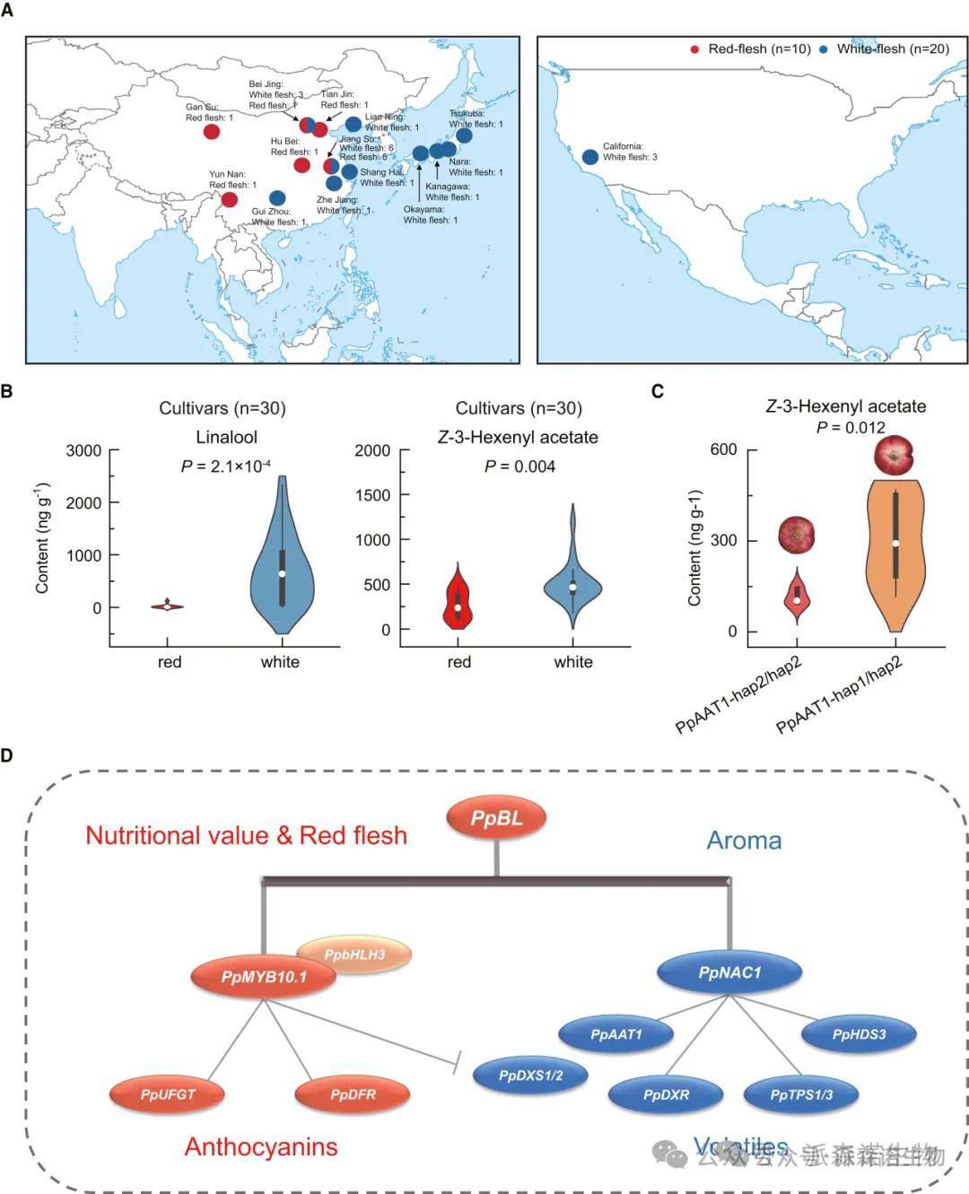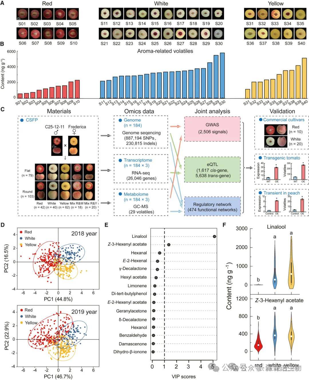 为了改善桃子的营养和风味,研究团队通过消费者评估,从33种挥发物中鉴定了11种与喜好正相关的挥发物,包括内酯、酯类和萜烯。然而,检测发现红肉桃品种的挥发物含量普遍较低,尤其是芳樟醇和Z-3-乙酸己烯酯的含量显著下降,分别降低了96.3%和51.9%,这与消费者对红肉桃香气偏好降低的现象一致。研究进一步通过杂交实验和多组学分析,建立了一个遗传平台,揭示了红肉与多数挥发物含量呈负相关,并确定了芳樟醇和Z-3-乙酸己烯酯是区分不同果肉颜色果实的关键挥发物。