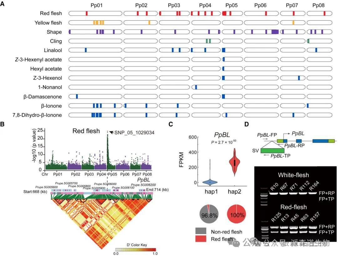 基于重测序数据,PCA分析显示两个亲本之间遗传背景差异大,后代存在显著性差异。遗传力分析显示肉色、芳樟醇和Z-3-乙酸己烯酯表现高遗传力,为GWAS分析提供了基础。在染色体Pp05上鉴定到一个与红肉密切相关的主要基因座,该基因座附近的NAC转录因子PpBL被发现是红肉桃中花色苷生物合成的调节因子。研究发现hap2种质中PpBL的表达比hap1种质高263倍,且红肉桃中存在一个位于PpBL基因上游320 bp的长末端重复-反转录转座子(LTR-RT),是导致PpBL高表达的原因。
