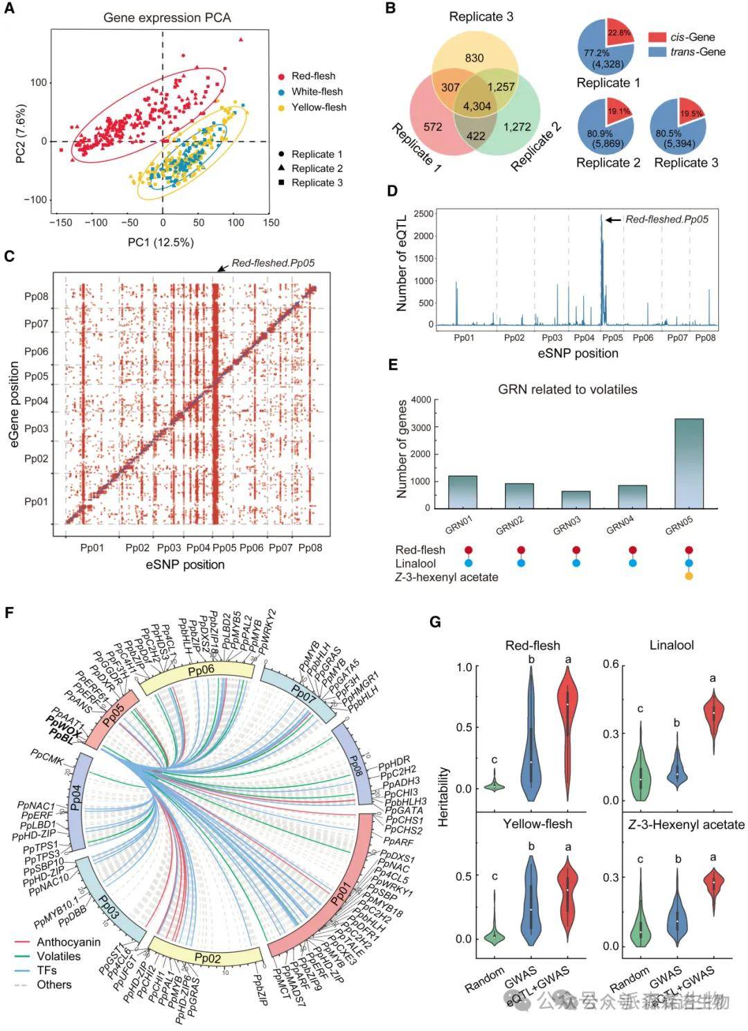 本研究通过在184个样本的CSFP群体中进行eQTL分析,发现了数万个eQTL,其中约80%为顺式eQTL,且在染色体Pp05上发现了一个名为Red-fleshed.Pp05的eQTL热点,与红肉、芳樟醇和Z-3-乙酸己烯酯相关。基于GWAS和eQTL数据构建的474个基因调控网络(GRN)中,GRN05与红肉和挥发物相关。GO分析显示,红肉果实中上调的基因与类黄酮代谢相关,而下调的基因与脂质和萜类代谢相关。此外,GWAS和eQTL的联合分析显著提高了表型解释率,例如芳樟醇(从13.3%提高到38.3%)和Z-3-乙酸己烯酯(从11.8%提高到26.9%)。这些结果表明eQTL分析为理解红肉果实中挥发物减少的分子机制提供了有力支持。