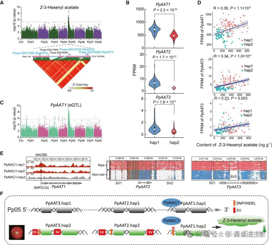 研究通过GWAS在染色体Pp05上鉴定到一个与Z-3-乙酸己烯酯相关的遗传位点,该位点包含五个串联的醇酰基转移酶(AAT)基因,其中PpAAT1表达水平最高。进一步研究发现PpAAT2和PpAAT3也能利用Z-3-己烯醇合成Z-3-乙酸己烯酯。eQTL分析显示PpAAT1、PpAAT2和PpAAT3均为顺式调控基因,且启动子区的SNP(Pp05_1981473)显著影响这些基因的表达水平。红肉桃中,PpAAT1的hap2单倍型、PpAAT2和PpAAT3的表达水平显著降低,与酯含量呈正相关。这些变异(包括SNP、插入缺失和结构变异)可能削弱了PpNAC1转录因子对PpAAT1的激活作用,并最终导致红肉果实中Z-3-乙酸己烯酯含量降低。