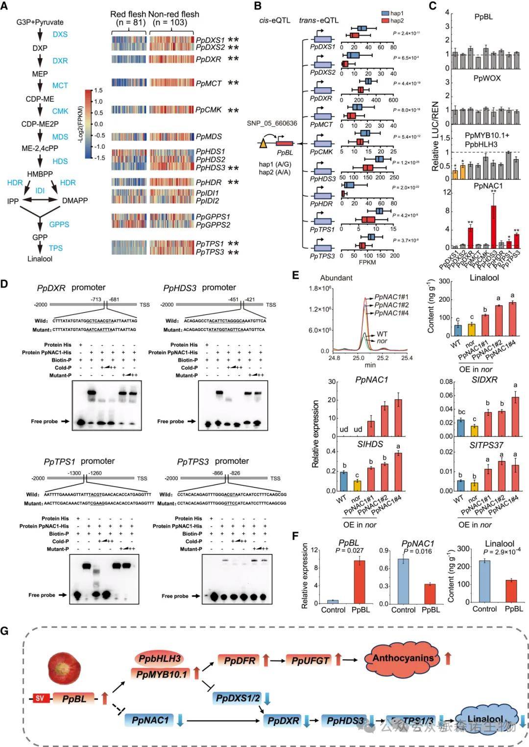 研究发现,红肉桃果实中与芳樟醇生物合成相关的多个基因(如PpDXS1、PpDXR、PpMCT等)转录水平显著降低。eQTL分析显示这些基因受Red-fleshed.Pp05位点的反式调控,其中PpBL在该位点的表达因单倍型不同而存在显著差异。此外,PpNAC1可激活MEP通路中的多个基因表达,并在转基因番茄中验证了其对芳樟醇合成的调节作用。
