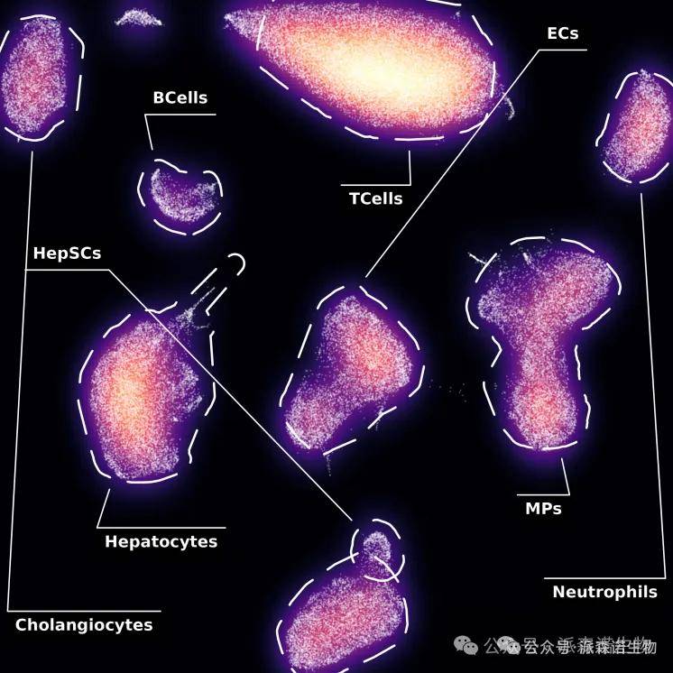 这是单细胞转录组测序数据分析里的单细胞转录测序星云图,把不同细胞类型(像图里的 B 细胞、T 细胞 、肝细胞等 )的基因表达信息,以类似 “星云” 的可视化形态呈现。不同色彩、形态的 “星云” 区域,对应特定细胞类型(如标注的各类细胞),能直观展现细胞群体在基因表达层面的异质性,想自己动手绘制?安排!