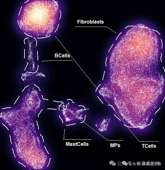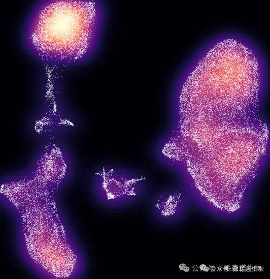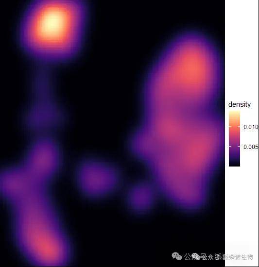 这样,细胞密度星云图就画完了,是不是比普通的Umap散点图漂亮呢?但是要注意只有细胞分类在降维图上的边界很清晰星云图才好看,不然的话可是会丑哭的呦~