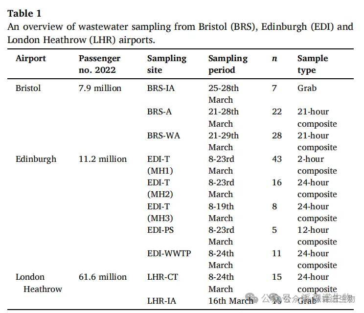 表1:布里斯托尔(BRS)、爱丁堡(EDI)和伦敦希思罗(LHR)机场废水取样情况。