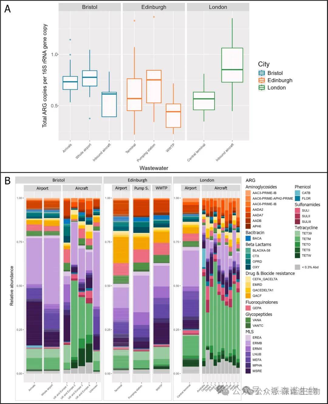 图1. (A) 显示相对于16S rRNA基因的ARG总丰度的箱形图。(B) 堆叠条形图显示了飞机和机场相关废水样本中HT-qPCR靶抗菌药物耐药基因(ARG)的相对丰度。除入境飞机外,相对丰度是每个废水源所有样本的平均值。