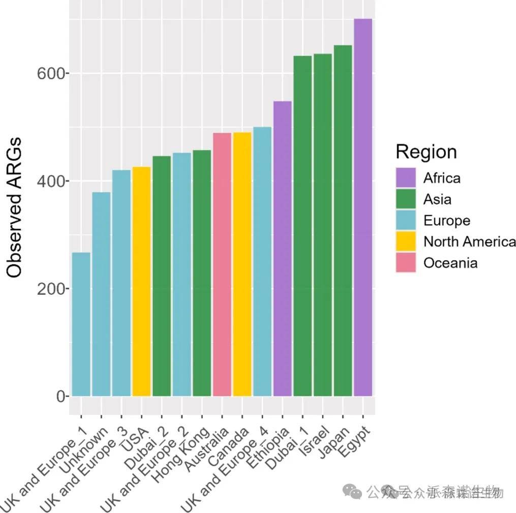 图3. 全球区域对入境飞机废水宏基因组分析中发现的抗菌药物耐药基因(ARG)总数的影响。