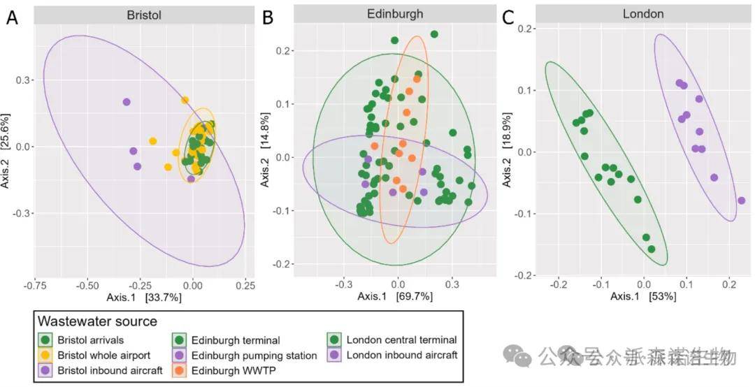 图4. 基于Hellinger转换的ARG相对丰度的Bray-Curtis相异矩阵的PcoA排序图,显示了(A)布里斯托尔、(B)爱丁堡和(C)伦敦希思罗国际机场废水样本之间的抗菌药物抗性基因(ARG)组成差异。