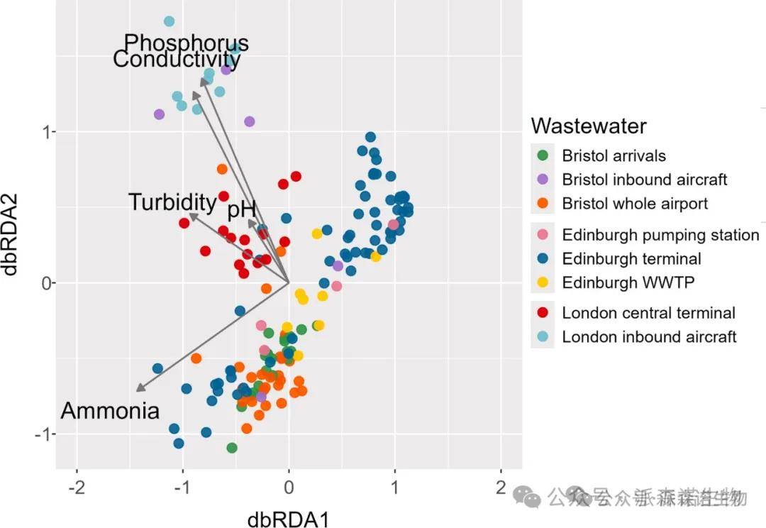 图5. 基于距离的冗余分析(dbRDA)显示了环境变量对机场相关废水样本中抗菌药物耐药基因(ARG)谱的影响。