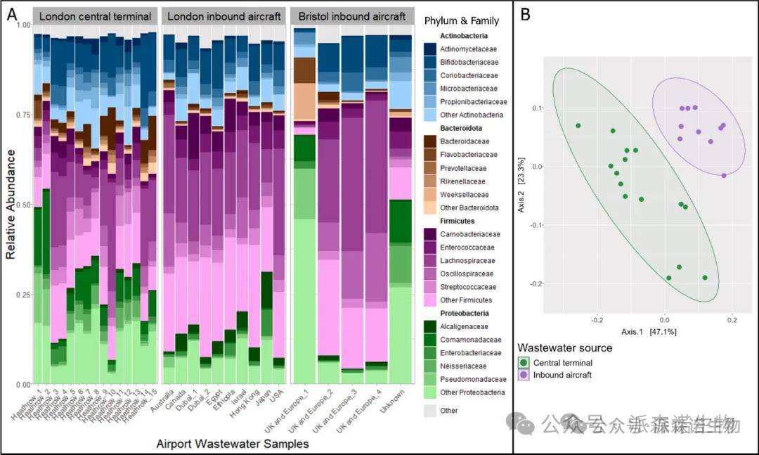 图6.(A) 堆叠条形图显示了宏基因组废水样本子集(B)中分类群的相对丰度。基于Hellinger转换的分类群相对丰度,Bray-Curtis相异性矩阵的PcoA排序图显示了伦敦希思罗废水样本之间的分类组成差异。