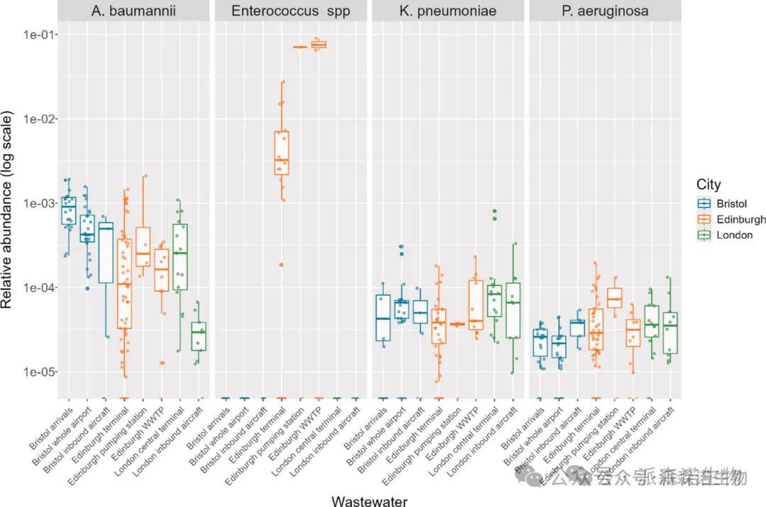 样本类型差异:鲍曼不动杆菌在机场(航站楼 、污水处理厂)废水中的相对丰度显著高于飞机样本(Welch t 检验,p<0.05)。肠球菌仅在爱丁堡机场(EDI)样本中检测到,且在泵站样本(EDI-PS)中的丰度显著低于国际航站楼(EDI-T)和污水处理厂(EDI-WWTP)样本(单因素方差分析p<0.01,f=9.122)。