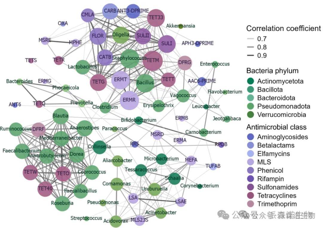 基于强(ρ>0.7)和显著(p<0.01)相关性)网络分析,探讨了40个最丰富的ARG和细菌属之间的共现模式(图8)。甲氧苄啶ARG、dfrF和几种四环素ARG-tetW、tetO和tet40-与多种细菌属相关,包括共生肠道菌群,如粪杆菌、Dorea和Ruminococcus。多个分类群与编码对不同类别(如sul1、catB、ermT、tetG和flor)的各种抗菌药物的耐药性的高度丰富的ARG相关,其中葡萄球菌的数量最多。