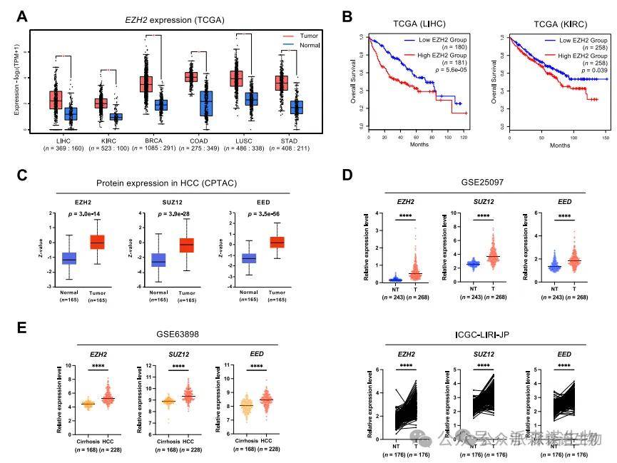 在TCGA和GEO多个HCC队列中,研究发现EZH2的mRNA和蛋白在肿瘤组织中显著升高,尤其在LIHC患者中表现出高度表达,并与更短的总生存期(OS)和无病生存期(DFS)显著相关。进一步分析其PRC2复合物的关键亚基SUZ12和EED也呈现相似趋势,显示出EZH2通路的广泛激活状态。通过蛋白组数据和基因表达数据库进一步证实其临床重要性,提示EZH2可能为预后评估与靶向治疗的潜在标志物。