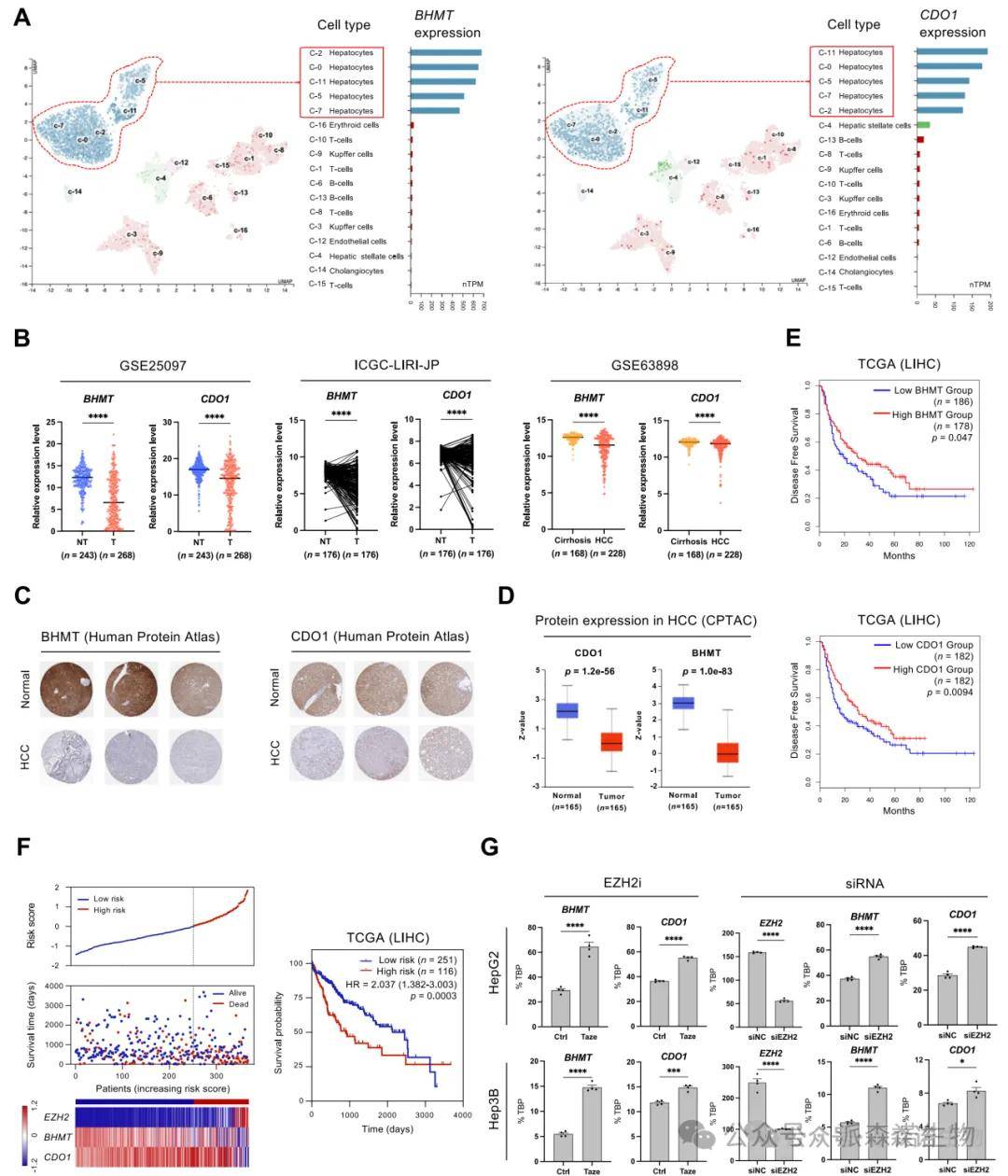 单细胞转录组数据揭示BHMT和CDO1在正常肝细胞中高度表达,而在肝癌组织中几乎沉默。多个HCC人群队列验证了这两个基因在癌组织中的显著下调。蛋白组数据也证实其在肿瘤组织中表达量下降。进一步的生存分析表明,BHMT与CDO1表达低的患者群体预后显著较差。研究还构建了基于EZH2、BHMT和CDO1的风险评分模型,有效区分高危与低危患者群体,提示其联合作为预后评分工具的潜力。