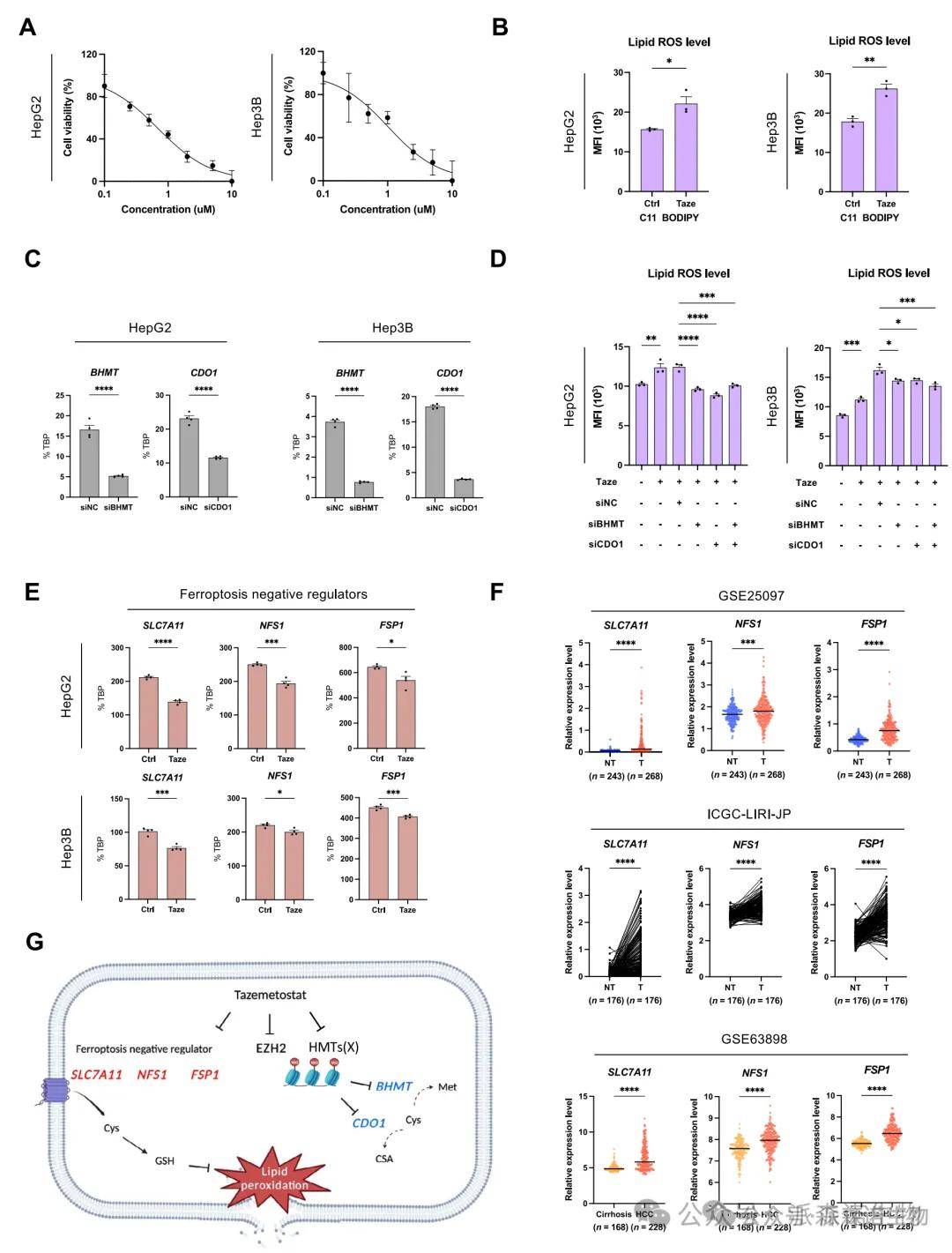 EZH2抑制剂Tazemetostat显著抑制肝癌细胞活力,并导致脂质ROS积累增强。进一步的机制分析发现,该效应主要通过恢复BHMT和CDO1表达,引发细胞内半胱氨酸耗竭,从而激活铁死亡程序。同时,EZH2抑制还下调了多个铁死亡负调控因子(SLC7A11、FSP1、NFS1),形成协同放大效应。虽然敲低BHMT和CDO1可部分减轻ROS积累,但不能逆转细胞死亡,提示多通路协同作用。此研究为靶向EZH2以激活铁死亡提供了全新策略。