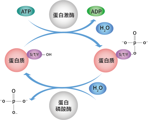 蛋白质磷酸化(Phosphorylation)是最常见、最重要的共价修饰方式。磷酸化的过程就是在激酶的催化作用下,将ATP的磷酸根基团转移到蛋白的氨基酸侧链(△M=79.9799 -H+H2O3P),蛋白的磷酸化和去磷酸化这一可逆过程几乎调节着生命活动的所有过程,包括细胞的增殖、发育和分化 ,细胞骨架调控、细胞凋亡等。