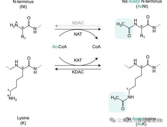 蛋白质乙酰化最早发现主要发生在细胞核内的组蛋白上,参与调控基因转录过程。后来,随着质谱技术的发展,发现在胞质或其他细胞器中大量的非组蛋白存在赖氨酸乙酰化修饰的现象,越来越多的非组蛋白的特定位点乙酰化已被证实可调节其活性、定位、特异性相互作用以及稳定性。蛋白质乙酰化(acetylation)是指在乙酰基转移酶(HATs/KATs)的催化下把乙酰基团(如乙酰辅酶A 等供体)共价结合到底物蛋白质的赖氨酸残基上的过程。此过程可以被去乙酰化酶 (HDACs/KDACs) 逆转,将乙酰化蛋白质去乙酰化。
