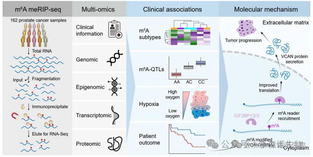 本研究构建了前列腺癌m6A修饰的系统性图谱,涵盖162例局限性原发前列腺癌样本,结合meRIP-seq、WGS、RNA-seq和蛋白组等多组学数据,揭示了m6A修饰在肿瘤发生发展中的多层级调控机制。研究发现m6A修饰在不同患者中具有显著异质性,可划分出5个m6A亚型,与肿瘤分级、体积、IDC/CA分型、基因组不稳定性及术后复发密切相关。研究进一步识别出大量m6A-QTL,揭示种系遗传变异对m6A水平的调控,并发现缺氧可广泛影响m6A图谱。功能验证表明,VCAN等基因的m6A修饰可增强mRNA稳定性和翻译效率,促进细胞增殖与迁移,且与患者不良预后显著相关。整体而言,该研究揭示了m6A修饰与遗传背景、微环境因素及肿瘤表型之间的复杂交互,为前列腺癌的精准诊疗提供了新的靶点和生物标志物。