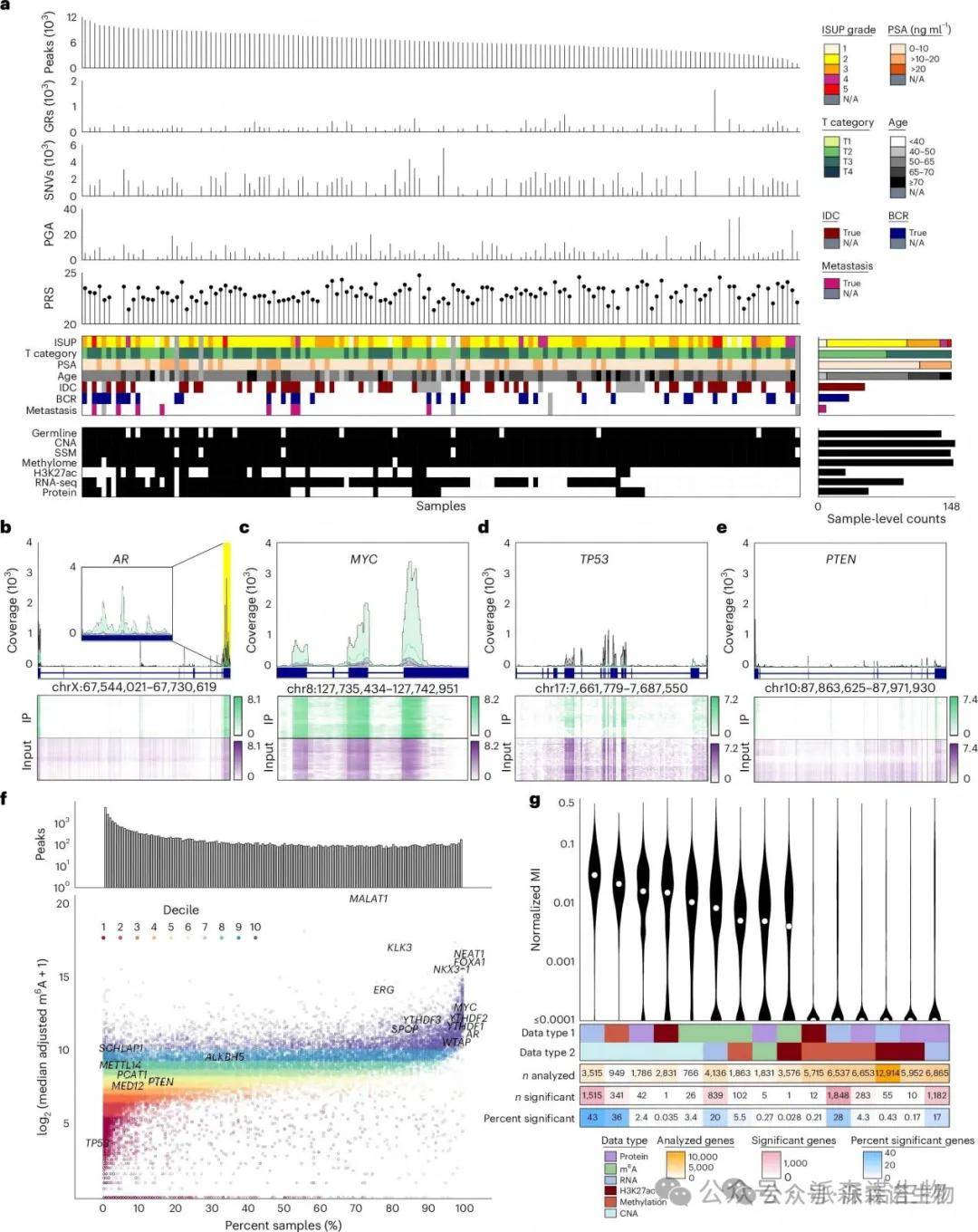 研究通过meRIP-seq对148例高质量局限性前列腺癌组织样本进行分析,识别出32,051个高置信度m6A峰,广泛分布于癌基因(如MYC、AR)及非典型肿瘤抑制基因中,并与RNA表达、CNV、甲基化等组学特征高度相关,构建出系统的前列腺癌表观转录组图谱。