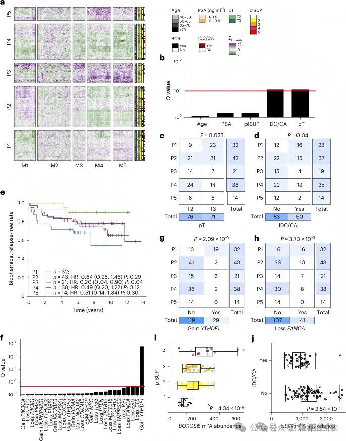 局部前列腺癌患者的五个m6A亚型与肿瘤大小、病理T分级、基因组不稳定性及手术后复发率显著相关。m6A亚型与已知信使RNA及拷贝数变化亚型存在关联,其特征体现在m6A相关的“writer”、“reader”和“eraser”的体细胞CNA模式中。此外,特定m6A峰与临床特征,如年龄、分级及IDC/CA的存在相关。在IDC/CA阳性病例中,m6A峰数量显著增加,同时观察到FANCA和TP53等肿瘤抑制基因的缺失。因此,m6A亚型及其特定位点模式为理解前列腺癌的临床特征提供了新的视角。