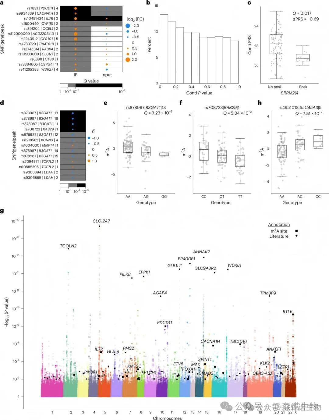整合WGS数据,识别出14,775个m6A-QTL,涵盖1,017个基因,包括多个驱动基因(如TP53、FOXA1)。特定SNP(如rs4951018)不仅影响m6A丰度,还同时调控目标基因的RNA和蛋白表达,揭示遗传变异通过m6A修饰参与癌症发生。