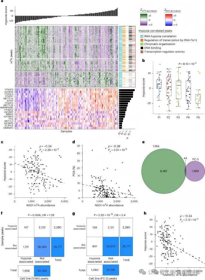 缺氧是局部前列腺癌的重要不良预后特征,关联肿瘤分级、侵袭性导管内癌及疾病复发。本研究识别出2,280个与缺氧相关的m6A峰,这些峰在缺氧肿瘤中丰度显著降低,主要集中于基因表达调控基因上。m6A调控因子的RNA丰度与缺氧状态呈相关性。此外,m6A患者亚型与缺氧关联,其中突变较少的P5群体为最规范氧群体。通过将V16A和PC-3细胞系暴露于0.2% O2 24小时,验证了缺氧相关的m6A峰,这些峰与原发患者的缺氧响应m6A峰显著重叠,进一步支持了缺氧与m6A分布之间的密切关联。