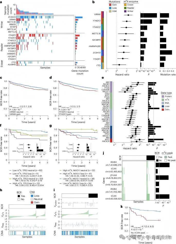 大多数肿瘤中m6A酶因体细胞突变而改变,且基因拷贝数丧失与RNA和蛋白丰度降低相关,这些变化在TCGA前列腺腺癌队列中得到了验证。分析1,239名患者的六个独立队列,发现拷贝数变化显著预测疾病复发。超过一半的m6A峰(3,432个)与前列腺癌驱动基因相关,富集于细胞组织和核酸代谢功能。生存分析显示,TP53和NKX3-1的m6A丰度与生化复发风险相关。此外,20,334个m6A峰的分析揭示,特定转录本上的峰与不良预后显著相关。
