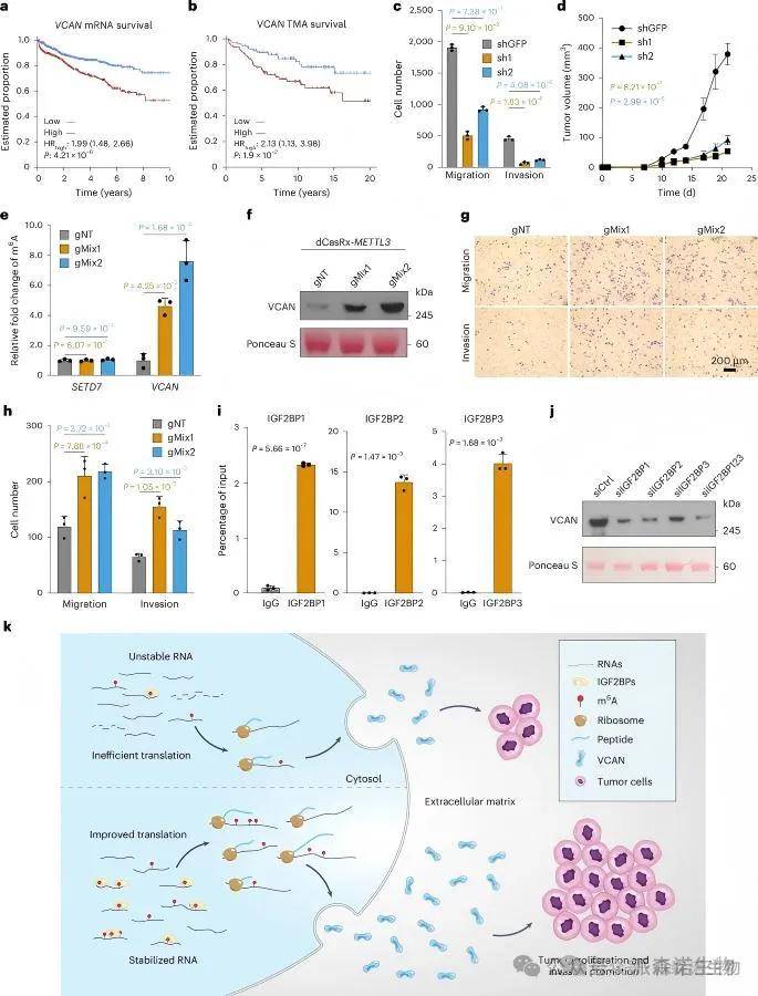 筛选并验证关键m6A修饰靶点VCAN,发现其m6A修饰增强mRNA稳定性和蛋白翻译效率,依赖IGF2BP蛋白复合物。VCAN高表达与不良预后、肿瘤侵袭性显著相关。shRNA敲低实验进一步证实VCAN促进肿瘤细胞增殖与转移,是潜在的治疗靶点。
