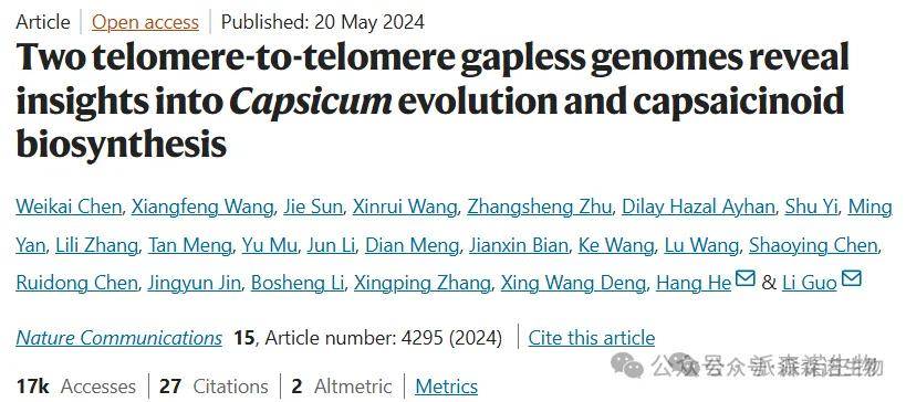 英文题目:Two telomere-to-telomere gapless genomes reveal insights into Capsicum evolution and capsaicinoid biosynthesis